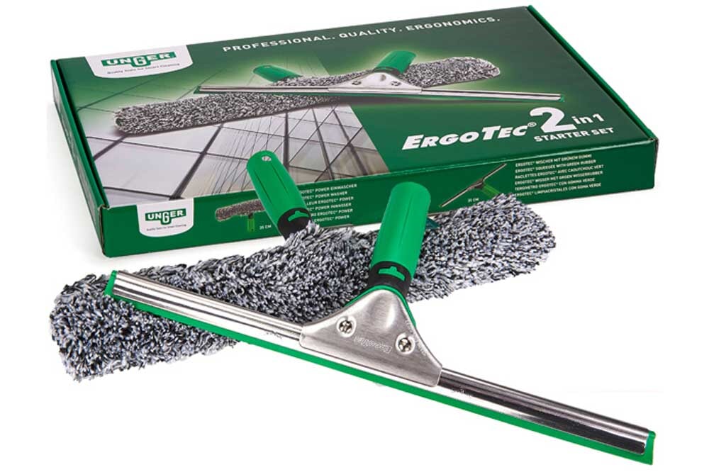 I dette Unger Ergotec start-settet til klassisk vinduspuss får du forvasker med pels og nalskinne med håndtak i god kvalitet.