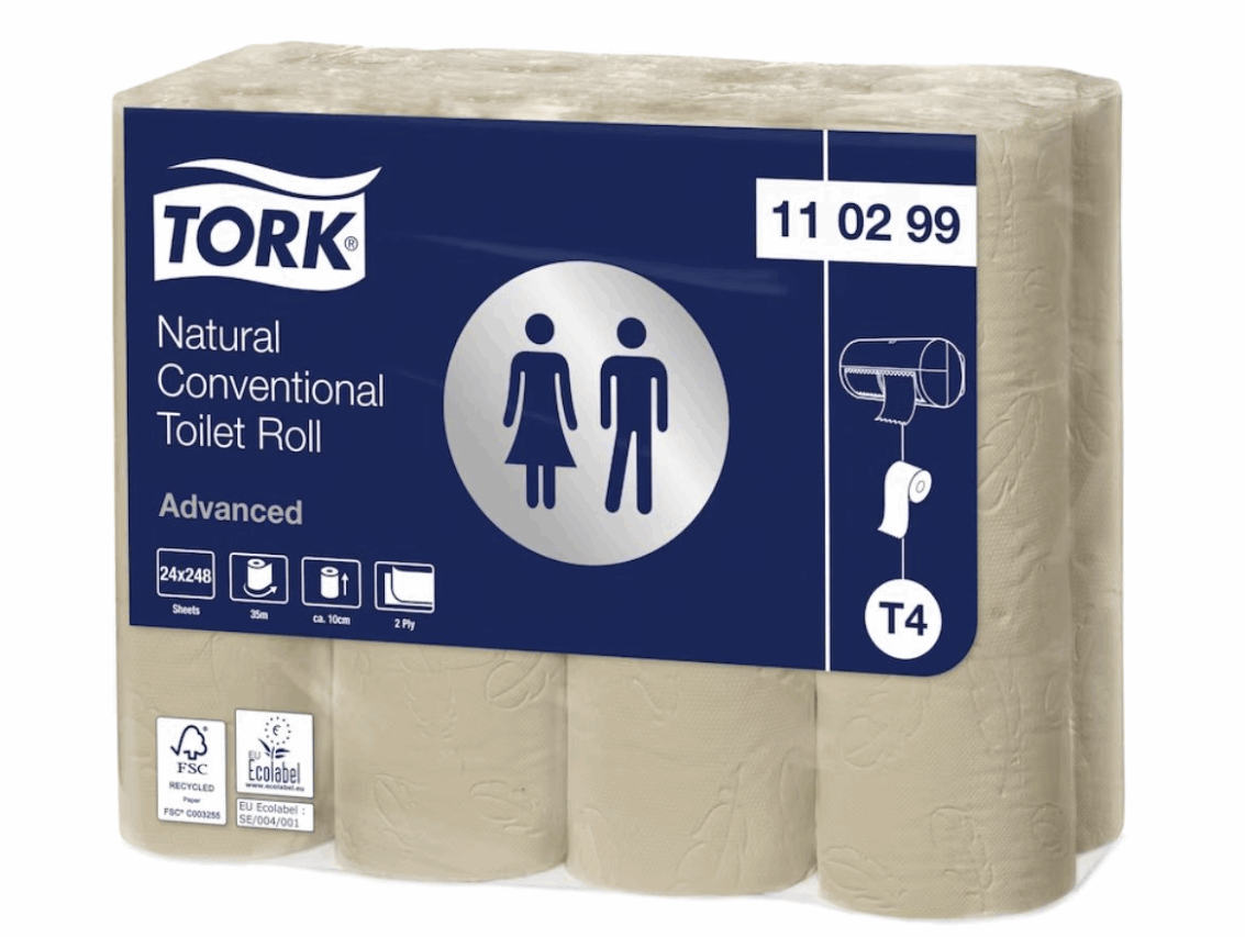 - Papiret er lysebrunt fordi vi blant annet bruker resirkulerte pappesker til å lage nytt toalettpapir. Dette er et godt valg hvis du ønsker å vise frem virksomhetens miljøengasjement og samtidig opprettholde den samme gode papirkvaliteten fra Tork.