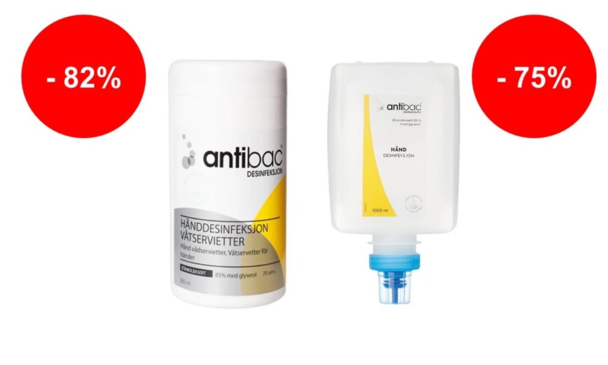 Supertilbud Selges ut til spotpris pga dato! Nå kan du gjøre et kupp på 601550 Antibac Hånddesi 85 % våtservietter 70 stk og 606001 Antibac Hånddesi 85 % flytende Modell X 1 liter. De selges ut med 82% og 75% rabatt pga dato som er 08.23 og 07.23. Rabatten gjelder kun disse partiene og så langt lageret rekker.