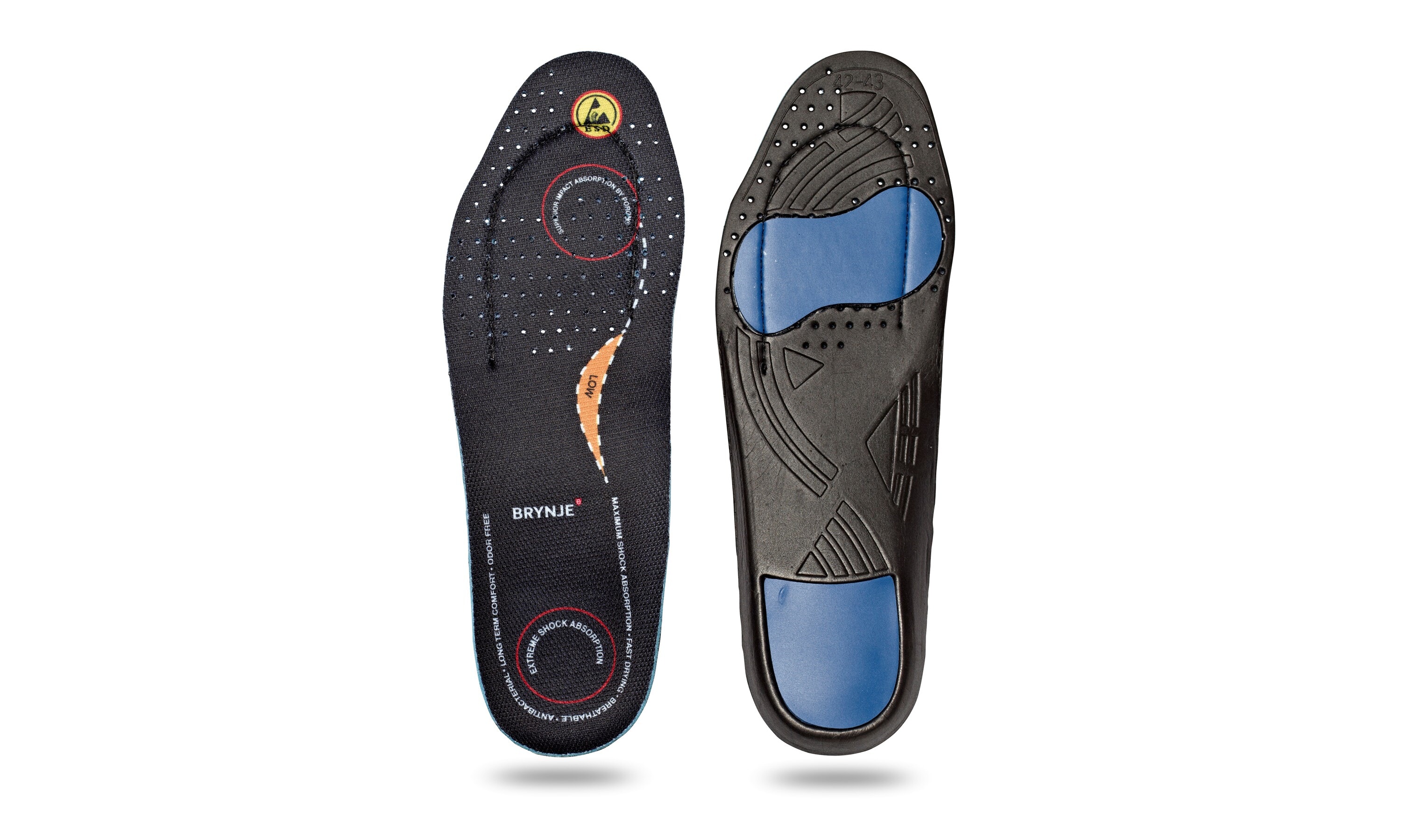 Eksklusiv innleggssåle fra Brynje designet for føtter med lav bue, gir stabil støtte og bedre belastningsfordeling ved lange arbeidsøkter.