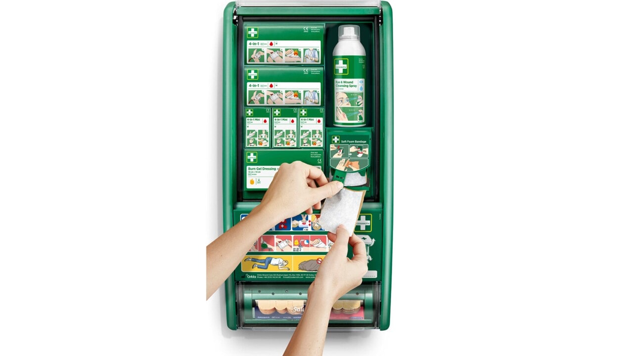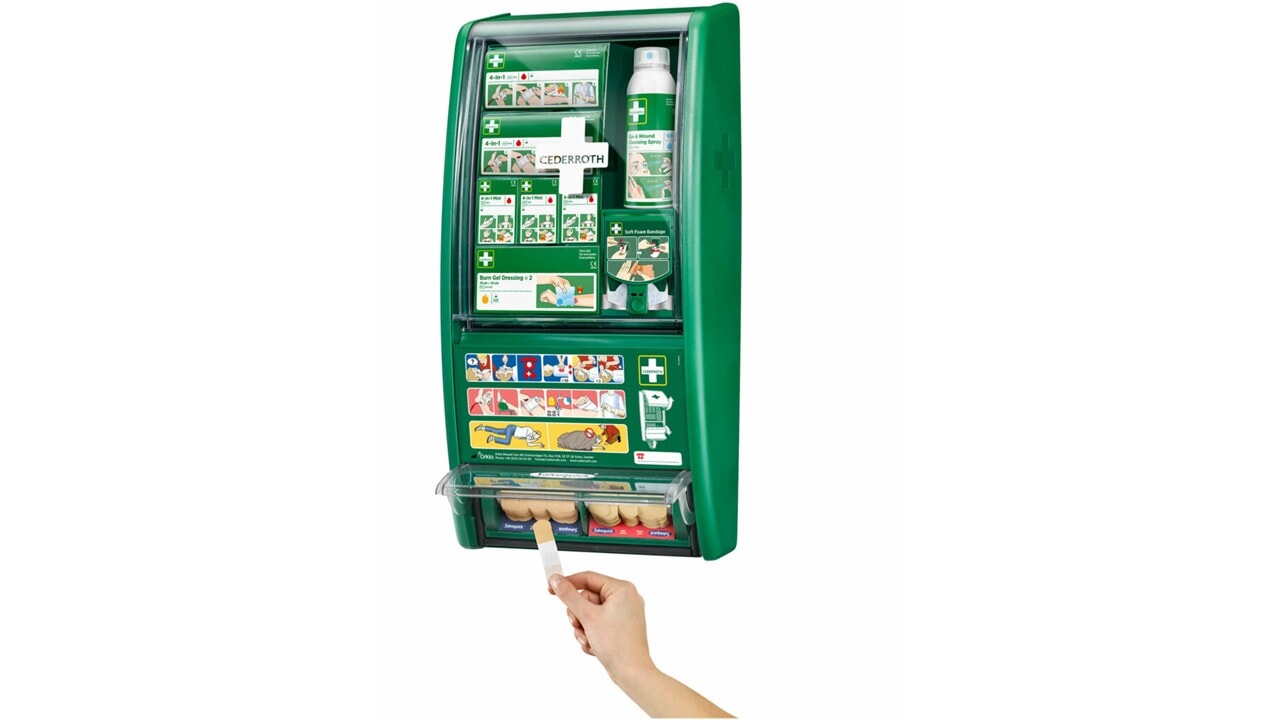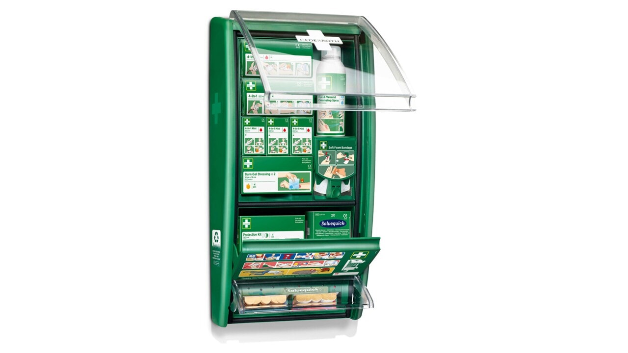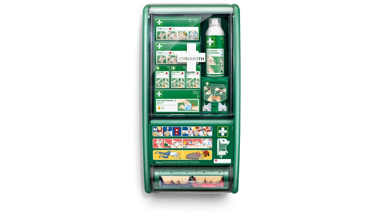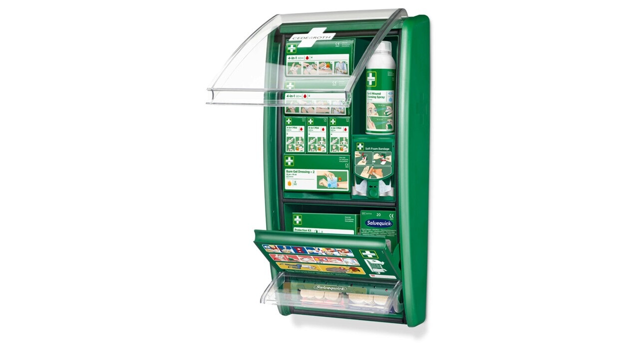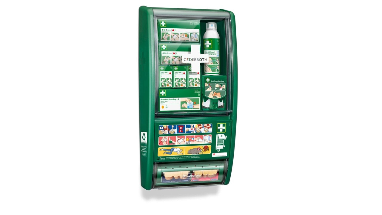 Cederroth Førstehjelpsstasjon er en komplett og oversiktlig løsning som gir rask tilgang til nødvendig førstehjelpsutstyr når uhellet er ute.