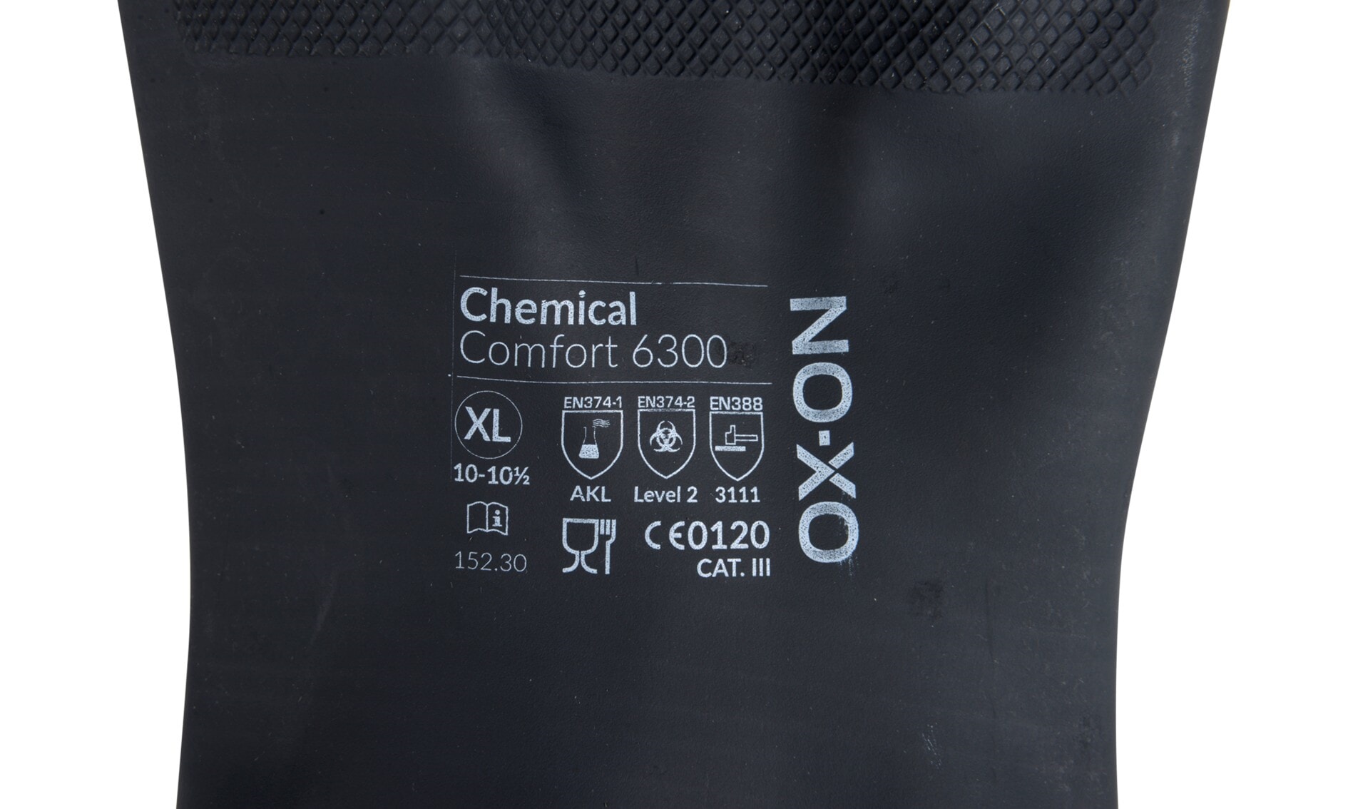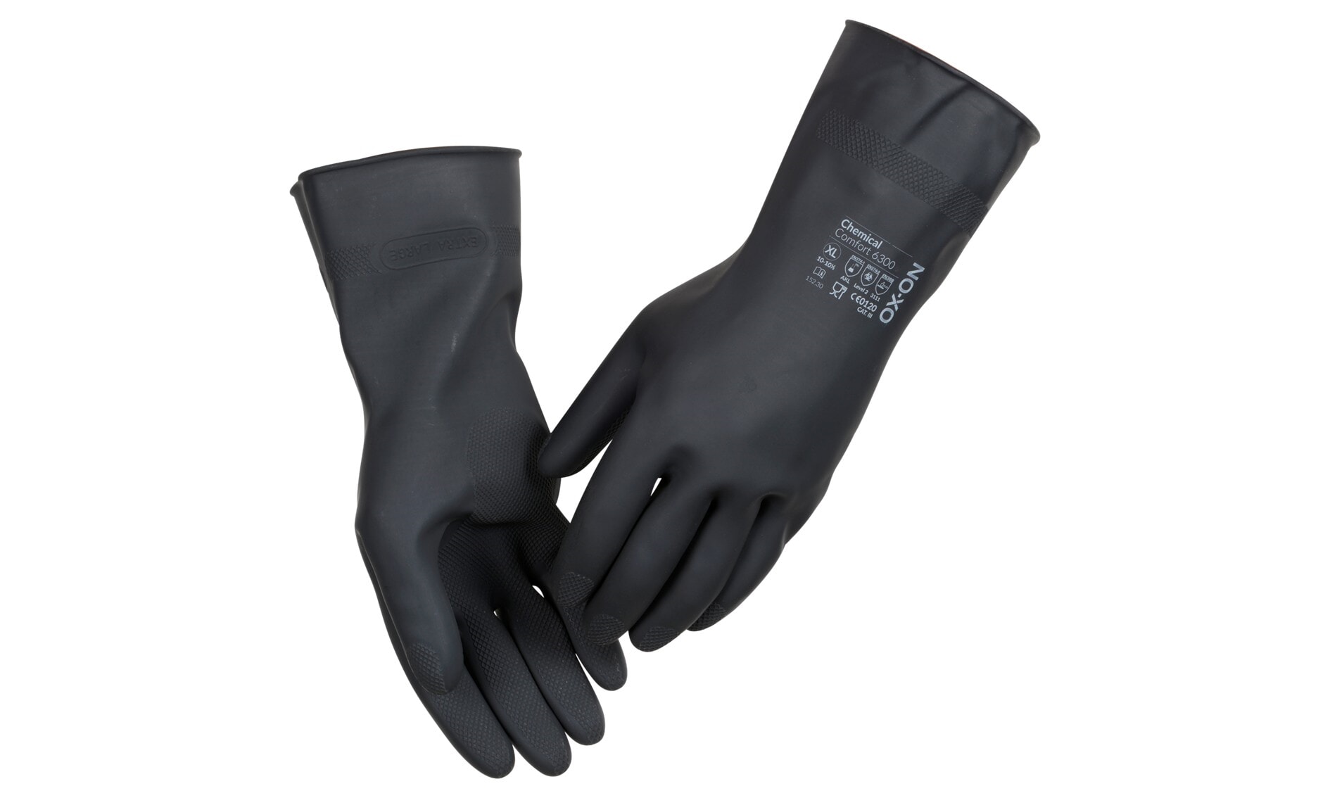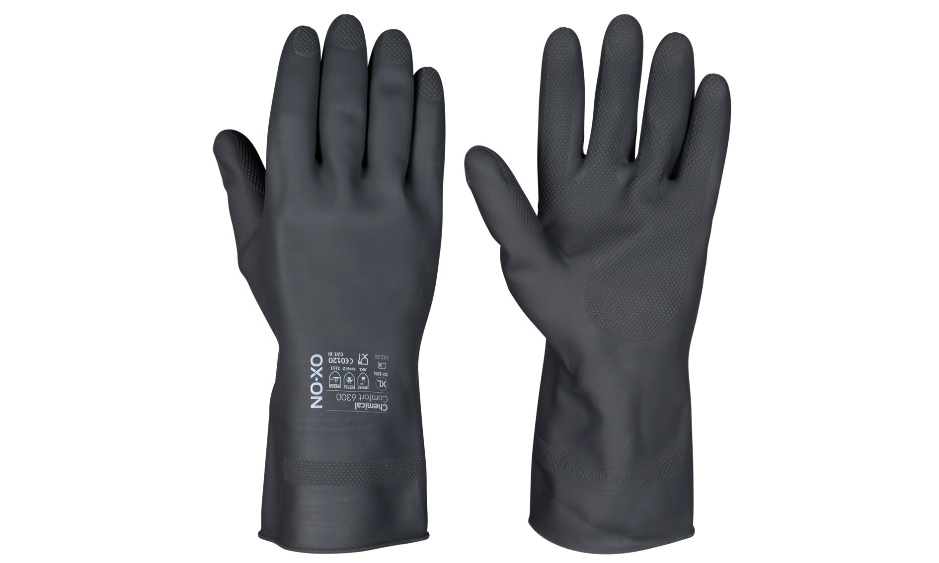 OX-ON Kjemikaliehanske sort 6300 er en robust kjemikaliehanske i kraftig, svart lateks, utviklet for profesjonelt arbeid innen renhold, kjemisk industri, laboratorier og næringsmiddelindustri. Hansken har en lengde på 30 cm og gir effektiv beskyttelse av både hånd og underarm.