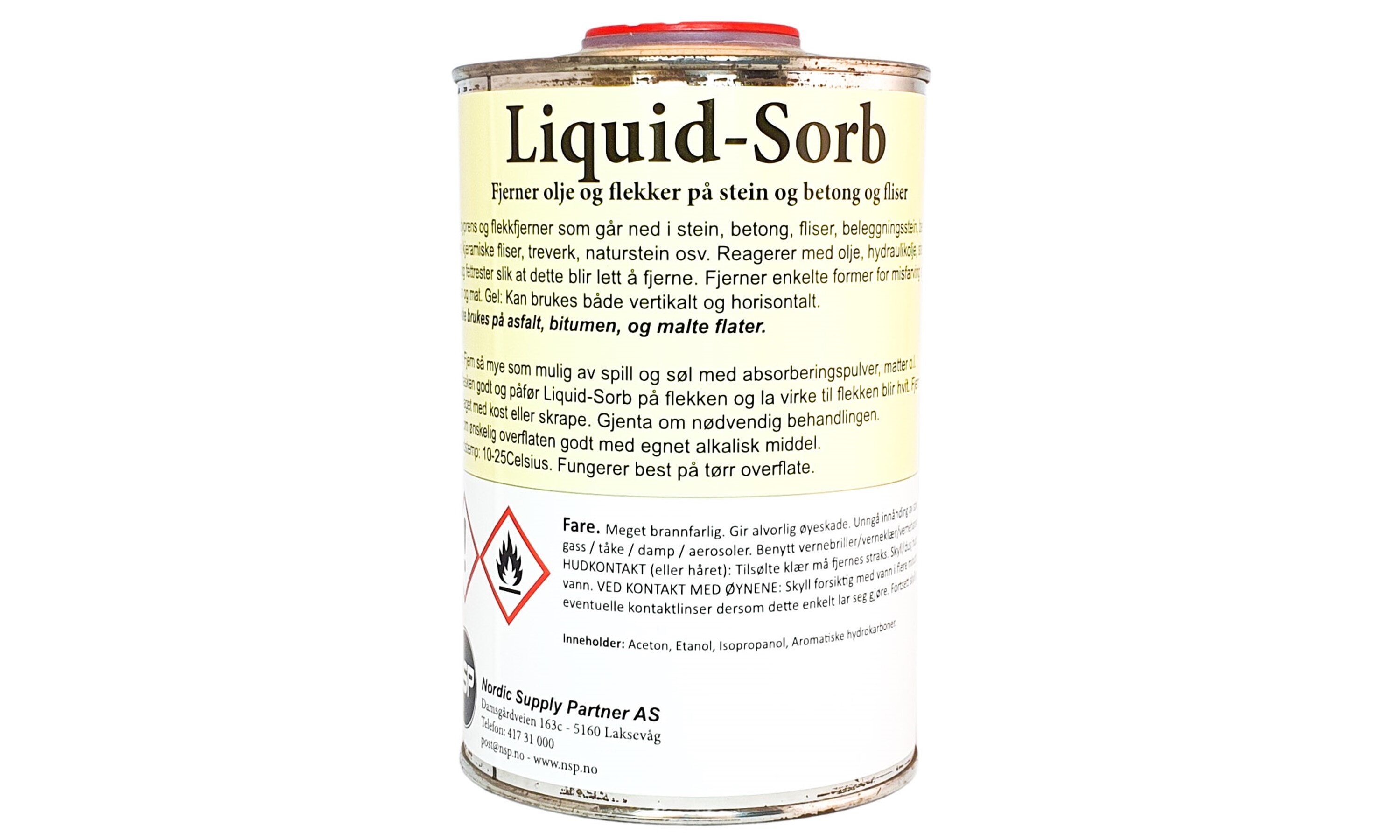 - Rist flasken godt og påfør Liquid-Sorb på flekken og la virke til flekken blir hvit