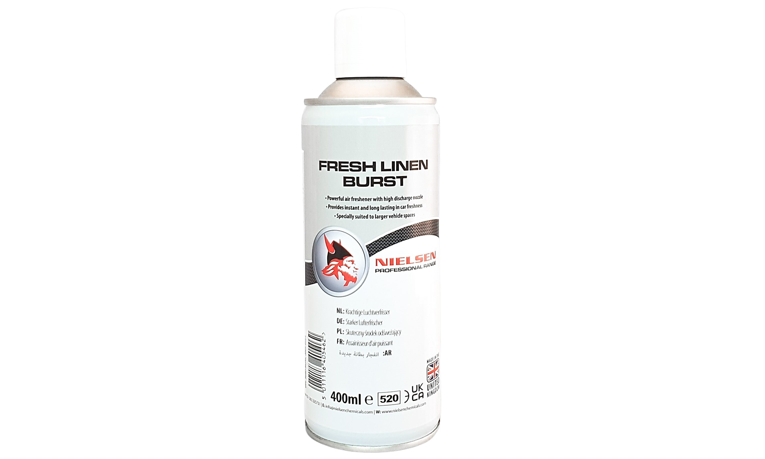 Fresh Linen Burst er en kraftig luftfrisker med en mild og behagelig duft av nyvasket tøy. Sprayboksen har spesialdyse som sprer duften over et større areal. Produktet etterlater frisk duft i lengre tid.